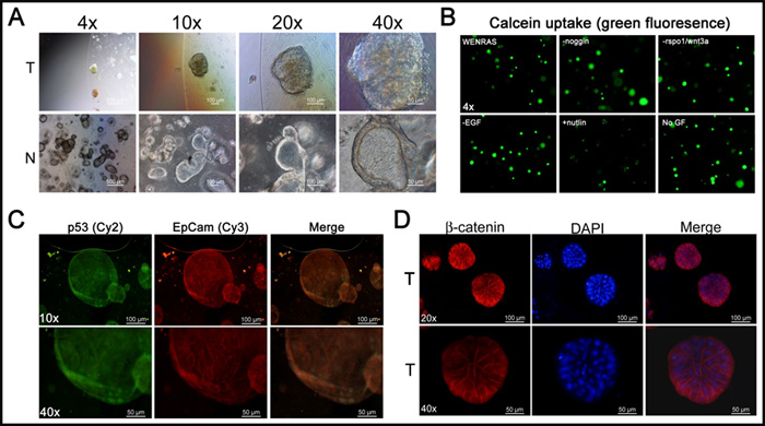 Figure 1: 3D colon cancer organoid cultures with growth in vitro and expression of tumor-associated markers. A. Bright field imaging of 3D organoid cultures of normal colon (N) and colorectal cancer (CRC) (T). B. Calcein uptake in CRC tumoroid culture subjected to selection using growth factor deprivation. Immunofluorescence for tumor markers p53, EpCam and beta-catenin C., D.