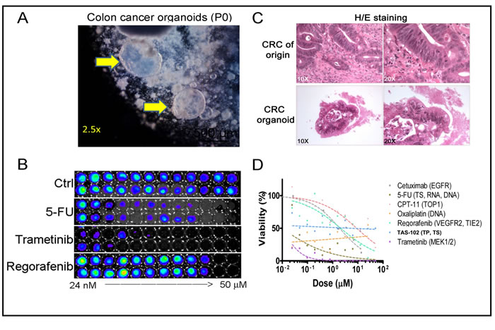 Figure 4: Assessment of CRC patient tumoroid responses to cytotoxic drugs in vitro at 2 weeks following tumor resection. A. Bright field imaging of 3D organoid cultures from a colorectal cancer (CRC). B. CellTiter-Glo (ATP content) was used to determine the dose-response characteristics of a CRC tumoroid following treatment with FDA-approved drugs and trametinib. A duplicate 12-point dose titer was used for each drug that was investigated with 5-10 organoids per 96-well. C. H/E staining of the CRC of origin and tumor organoid cultures. D. Dose-response relationship of FDA- approved drugs and trametinib in CRC tumoroid cultures.