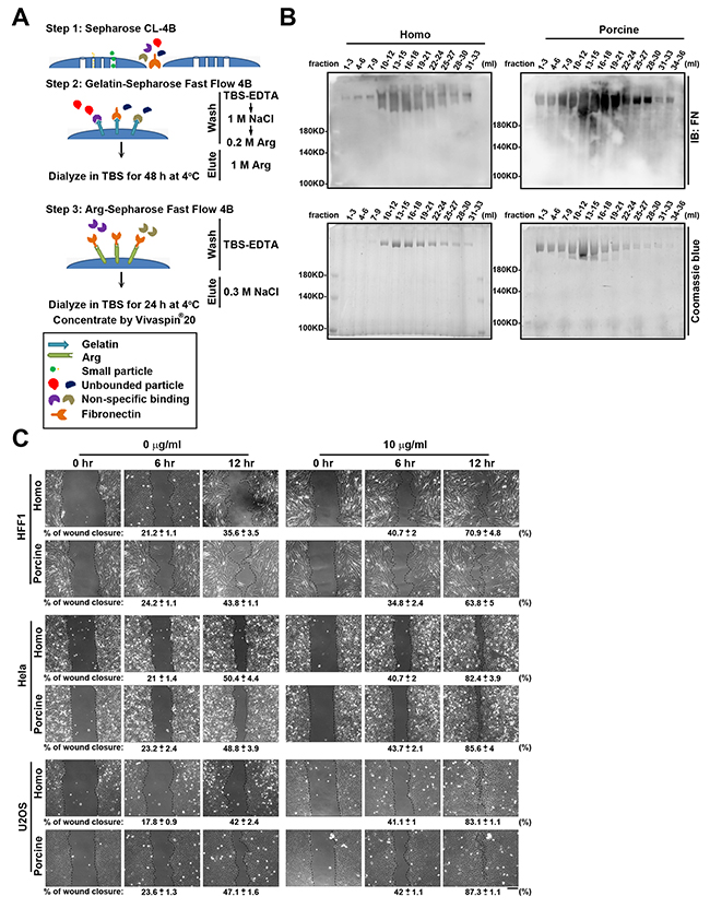 Figure 1: Fibronectin purification from homo and porcine plasma. (A) Flow diagram of the purification steps used to isolate fibronectin from homo and porcine plasma. In step 1, cleared plasma was passed through a pre-column of Sepharose CL-4B in order to collect high molecular weight proteins. In step 2, the flow-through materials obtained from Sepharose CL-4B was loaded on a pre-column of gelatin-Sepharose Fast Flow 4B. After removing unbound proteins by sequentially washed with TBS-EDTA, 1 M NaCl and 0.2 M Arginine (Arg), the fibronectin was eluted with 1 M Arg and then dialyzed against TBS for 48 h at 4°C. In step 3, dialyzed material was applied to an Arg-Sepharose Fast Flow 4B column. After washing the column with TBS-EDTA, the fibronectin was eluted from the gel using 0.3 M NaCl/TBS-EDTA, and then dialyzed against TBS for 24 h at 4°C. Finally each of the fibronectins were concentrated using a Vivaspin 20 centrifugal concentrator (Molecular Weight Cut Off: 100 kDa). (B) The eluted fractions obtained from the Arg-Sepharose Fast Flow 4B column were analyzed by Western blotting using antibodies against fibronectin (FN) and Coomassie blue staining. (C) HFF1, Hela and U2OS cells plated on 6-well plates coated with 0 and 10 μg/ml homo or porcine plasma fibronectin for 16 h were assayed for wound-healing migration, which was monitored by time-lapse microscopy. The still images were obtained at the indicated times after wounding. The dotted lines mark the edge of the wound at the 0-h, 6-h and 12-h time points of wound-healing migration. Bar, 200 μm. Bottom: the percentage of wound closure was calculated using Metamorph software. Data are mean ± s.e.m. (n = 5 independent experiments).