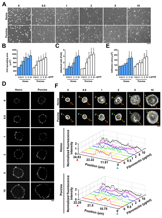 Figure 2: Cell adhesion in response to homo and porcine plasma fibronectin. (A) U2OS cells were plated on coverslips coated with the indicated fibronectin concentration (μg/ml) for 30 min and then the images were taken by phase contrast microscopy. Bar, 100 μm. (B) The plot shows the area of cells spreading on coverslips coated with the indicated fibronectin concentration (μg/ml). Data are mean ± s.e.m. (n = 80 cells in every condition). ***p < 0.001. (C) U2OS cells were plated on the indicated concentration of fibronectin for 30 min and then their cell attachment was measured. Fold of cells remaining attached on the indicated concentration of fibronectin relative to that on 0 μg/ml fibronectin. Data are mean ± s.e.m. (n = 8 independent experiments). *p < 0.05; **p<0.01; ***p < 0.001. (D) TIRFM images of U2OS cells that had been plated for 1.5 h on coverslips coated with the indicated fibronectin concentration and immunostained with paxillin. Bar, 10 μm. (E) Plot shows the sum of the total area of paxillin-marked focal adhesions within a cell versus the fibronectin concentration. Data are mean ± s.e.m. [homo: n =15 cells (0 μg/ml), 20 cells (0.5 μg/ml), 13 cells (1 μg/ml), 20 cells (2 μg/ml), 18 cells (5 μg/ml), 15 cells (10 μg/ml); porcine: n= 9 cells (0 μg/ml), 14 cells (0.5 μg/ml), 11 cells (1 μg/ml), 9 cells (2 μg/ml), 11 cells (5 μg/ml), 10 cells (10 μg/ml)]. *p < 0.05; **p<0.01; ***p < 0.001. (F) Confocal images of U2OS cells that were plated for 1.5 h on coverslips coated with the indicated fibronectin concentration (μg/ml). Bar, 10 μm. (Bottom) Relative fluorescence intensity taken along the line highlighted in the confocal image with the edge being marked with arrows and the distance.
