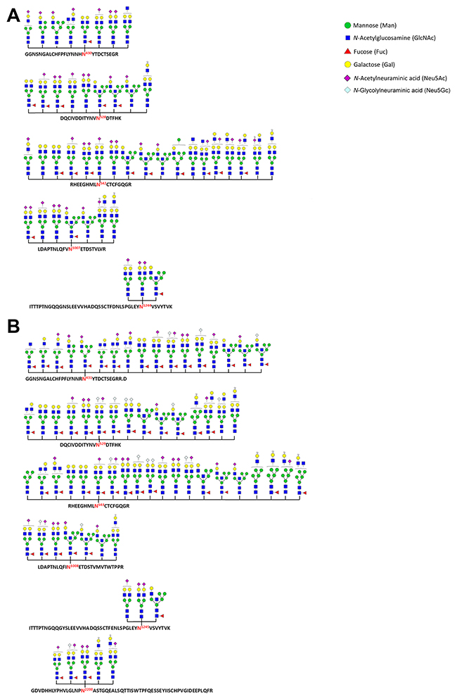 Figure 3: N-glycosylation sites and N-glycans identified as present within homo and porcine plasma fibronectin. A database search using Byonic™ identified N-glycan + peptide combinations from homo (A) and porcine (B) plasma fibronectin with each site being shown using the standard symbol nomenclature for glycans system [48]. The N-glycan structures are mostly inferred from the assigned glycosyl compositions (see Supplementary Tables 2 and 3) without any further attempt to verify their isomeric arrangement.