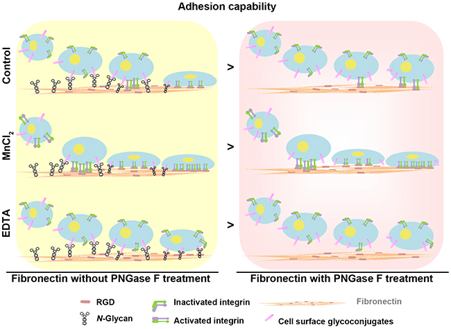 Figure 6: Model showing the synergistic effects of N-glycans and the RGD sequence of fibronectin on the regulation of cell adhesion capability. N-glycans act synergistically with the integrin-binding regions (RGD sequence) of plasma fibronectin to support cell adhesion and wound-healing migration.