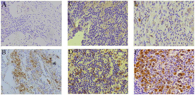 Figure 1: PD-L1, PD-1, and TS immunohistochemistry analysis. Representative immunohistochemistry images of PD-L1 negative (A) and positive (B) expression, PD-1 negative (C) and positive (D) expression, TS low (E) and high (F) expression in tumor specimens. Magnification, 200×.