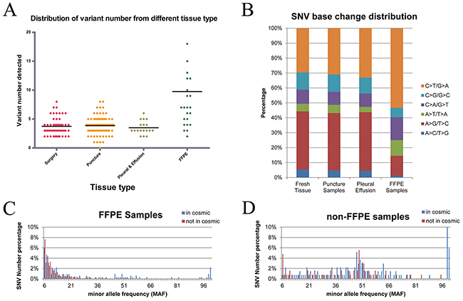 Figure 3: Distribution of variant numbers in different sample types and the distribution of variations in FFPE tumor samples. (A) Distribution of variant numbers in different sample types. The black lines are the median number for the variant number of the corresponding sample types. The amounts of genetic variants per sample of FFPE samples were nearly twofold higher than those of the other fresh samples. (B) FFPE tumor samples included more C > T/G > A and fewer A > G/T >C mutations. (C) Most of SNVs. detected in the FFPE tumor samples were concentrated at the lowest MAF (less than 0.1) and were not included in the COSMIC database. (D) MAF of SNVs detected in the non-FFPE tumor samples demonstrates a similarly bi-modal distribution owing to less mutations with low allele frequency.
