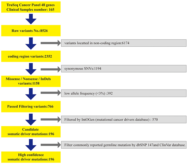 We further filtered the 766 variants by IntOGen cancer drivers database, and then data were filtered by the commonly reported germline mutation dbSNP (release 147) and ClinVar database. In the end, we obtained 196 somatic driver mutations for subsequent analysis (Figure 4).