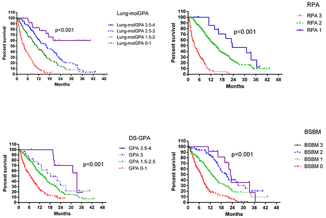 The present study reappraised the new Lung-molGPA index to determine its applicability in a Chinese patient cohort. The resultant scores were compared with those from three other published prognostic systems (RPA, BS-BM, DS-GPA), and predictive values were assessed.