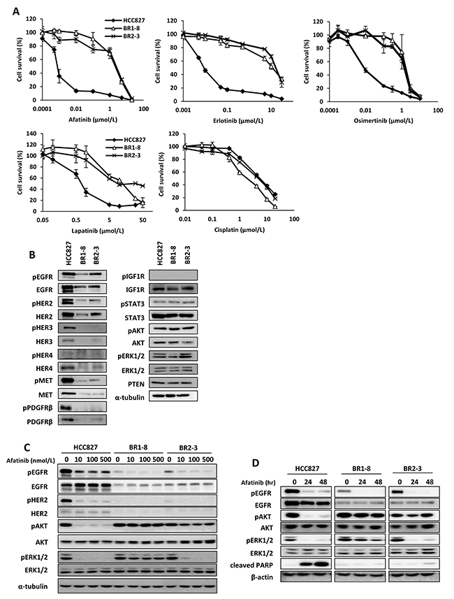 IC50 values (μmol/L) were calculated from the logit regression curves of triplicate dishes. The IC50 values for afatinib, gefitinib, erlotinib, osimertinib, lapatinib, picropodophyllin, SU11274, PD173074, AZD4547, sorafenib, BIBF1120, and cisplatin were as follows: 0.00079±0.00005, 0.0078±0.001, 0.0087±0.0004, 0.0090±0.0019, 4.33±0.82, 0.61±0.04, 4.42±0.23, 11.50±0.32, 7.08±0.30, 5.50±0.55, 1.96±0.09, and 5.55±1.34 in HCC827, 2.05±0.25, 12.60±0.716, 11.31±0.32, 1.50±0.50, 16.76±1.63, 0.61±0.04, 5.16±0.17, 12.04±2.31, 6.94±0.41, 6.06±0.21, 2.33±0.11, and 1.90±0.33 in BR1-8 cells, and 2.38±0.31, 14.33±0.813, 16.97±0.76, 1.39±0.14, 16.38±1.28, 0.68±0.03, 5.04±0.08, 16.53±0.53, 7.67±0.40, 4.99±0.12, 3.5±0.4, and 4.98±0.91 in BR2-3 cells, respectively. Relative resistance was defined as the IC50 ±S.D. values divided by the IC50 values of the parental HCC827 cells.