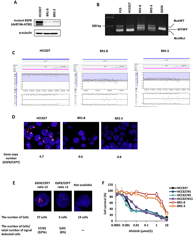 Figure 2: EGFR gene amplification in drug-resistant sublines. (A) Decreased expression of delE746-A750 EGFR in drug-resistant sublines compared with HCC827 cells. (B) Levels of mutant and wild-type EGFR. PCR analysis detected only mutant homoduplexes (Mut/Mut) in HCC827 cells, and wild-type (WT/WT) homoduplexes in QG56 cells harboring wild-type EGFR, and heteroduplexes (Mut/WT) and homoduplexes (WT/WT) and (Mut/Mut) in BR1-8, BR2-3, and PC9 cells harboring the EGFR delE746-A750 mutant. (C) Alterations of the coding region of EGFR on chromosome 7 in HCC827 cells and drug-resistant sublines were determined using an Oncoscan array. The upper and lower plots show log2 ratios and B-allele frequencies, respectively. (D) FISH analysis using EGFR (red) and chromosome 7 centromere (CEP7) (green) probes of HCC827 cells and drug-resistant sublines. The number of the fluorescent signals corresponding to EGFR or CEP7 was counted, and the EGFR/CEP7 ratio was calculated. (E) The presence and absence of EGFR gene amplification of 75 cells of HCC827. FISH analysis was assessed by using EGFR (red) and chromosome 7 centromere (CEP7) (green) probes. The number of the fluorescent signals corresponding to EGFR or CEP7 was counted. (F) Cellular sensitivity of three clones of HCC827 (#1, #2 and #13) with or without EGFR gene amplification to afatinib. Cells were exposed to various concentrations of afatinib for 72 h and viability was assessed using a WST assay.