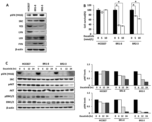 Figure 3: The effect of dasatinib on AKT and ERK signaling in HCC827 cells and its drug-resistant sublines. (A) The expression of SFK family proteins and activation of SFKs. (B) The inhibitory effects of dasatinib on cell survival of HCC827, BR1-8, and BR2-3 cells. Each value represents the average of triplicate dishes for each cell line. *P < 0.05. (C) Western blot analysis of the inhibitory effects of incubating cells with dasatinib (100 nmol/L) for 6, 12, and 24 h. The quantification of the western blots is shown, and the values were normalized to those of β-actin.