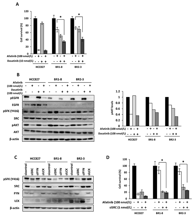 Figure 4: Coadministration of afatinib with dasatinib or administration of afatinib to cells transfected with a SRC siRNA on the survival of drug-resistant sublines. (A) Sensitivity to dasatinib with or without afatinib. Cells were exposed for 72 h and subjected to a WST assay. *P < 0.05 vs afatinib and dasatinib treatment. (B) The inhibitory effect of afatinib, dasatinib, or both on AKT activation. Cells were exposed to afatinib (100 nmol/L), dasatinib (100 nmol/L), or both for 6 h. (C) The expression of pSFK, SRC, FYN and LCK after cells were transfected with a cognate siRNA. Cells were treated with various amounts of siRNA for 72 h. (D) The effect of the SRC siRNA on the sensitivities of cells to afatinib. Cells were transfected with the SRC siRNA (1 nmol/L) for 48 h and then treated with afatinib (100 nmol/L) for 72 h. Each value represents the average of triplicate dishes for each assay. *P < 0.05 vs SRC siRNA and afatinib treatment.