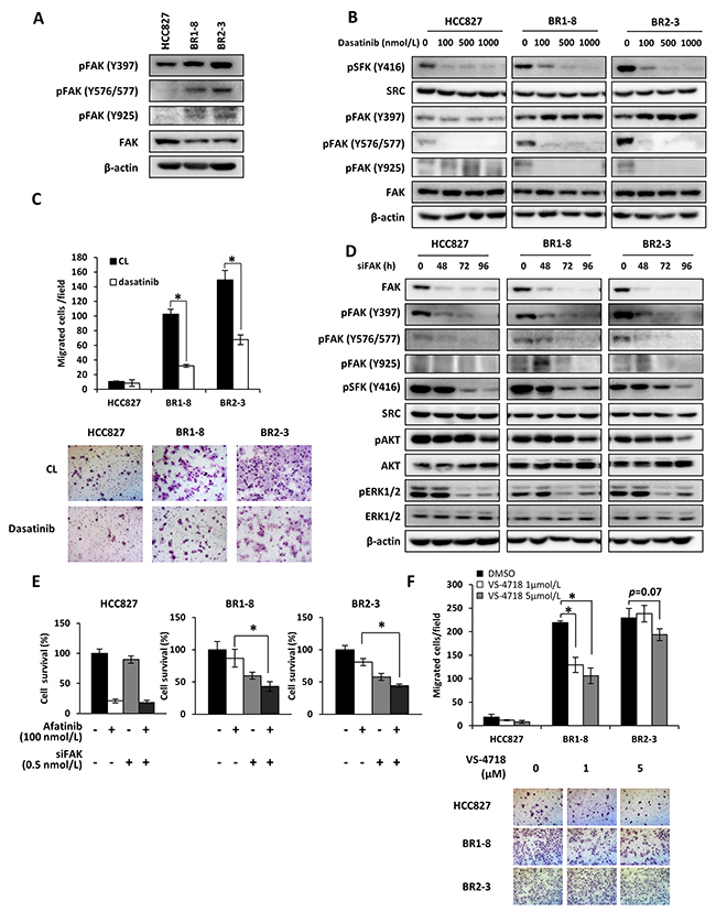 FAK activation promotes cell migration and invasion [41]. Therefore, we determined whether a FAK inhibitor inhibited the migration of the drug-resistant sublines. VS-4718 was shown to inhibit the FAK activity of cancer cells [43]. The sensitivities of afatinib-resistant sublines to VS-4718 were similar to those of HCC827 cells (data not shown). The migration of the drug-resistant sublines was 10-fold higher compared with that of HCC827 cells. VS-4718 significantly (p<0.05) inhibited the migration of BR1-8 cells and also that of BR2-3 cells (p=0.07) (Figure 5F). Together, the data indicate that activation of the SFK/FAK pathway is the main mechanism of survival and migration of afatinib-resistant cells.