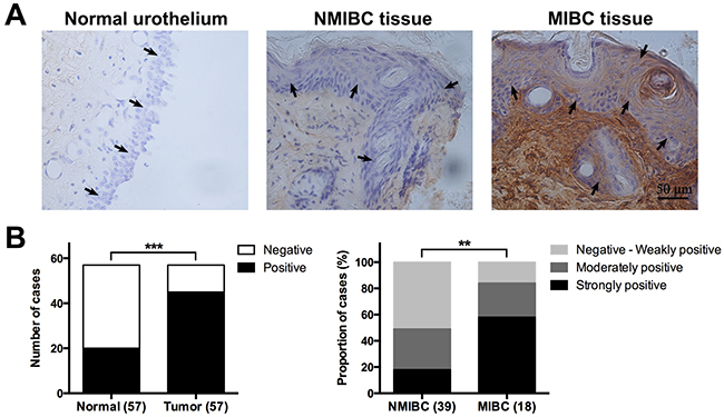 Figure 1: CCN2 expression in tumor/non-tumor urothelial tissues. (A) Representative images of CCN2 staining for normal urothelium, NMIBC and MIBC tissues, respectively; bars: 50 μm. (B) Comparison in distribution of CCN2 staining status (positive or negative) between normal urothelial and UBC tissues (left panel) and that in distribution of CCN2 immunoreactivity levels (negative to weakly positive, moderately positive, strongly positive) between NMIBC and MIBC tissues (right panel). Data presented as number or percentage of patients. **, P < 0.01; ***, P < 0.001.