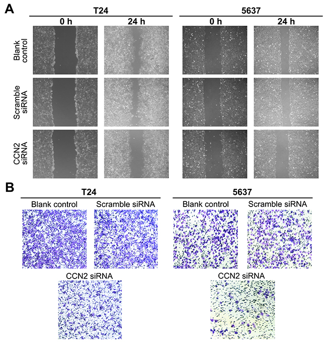 Figure 3: Down-regulation of CCN2 inhibits migration and invasion of UBC cells. (A) T24 and 5637 cells were either without transfection (blank control) or transfected with CCN2 or scramble siRNA, and then subjected to wound healing assay to determine the migration capacity at 24 h following scarification. (B) Transwell assay was carried out to evaluate the invasion capacity of UBC cells.