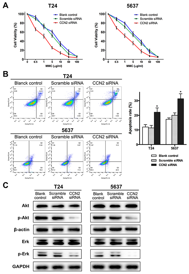 Figure 5: Down-regulation of CCN2 increases sensitivity of UBC cells to MMC via inhibiting activation Akt and Erk pathways. (A) CCK-8 assay was performed to estimate survival rate curves of all groups after 24 h treatment with MMC at different concentrations. (B) Representative cell apoptosis distribution of each group as detected by FCM; region Q1, Q2, Q3 and Q4 shows dead, late apoptotic, early apoptotic and living cells, respectively; Q2 + Q3 regarded as apoptotic cells; all groups were treated with 100 μg/mL of MMC for 2 h after 48 h of transfection and then cultured in complete medium without MMC for 24 h, before apoptosis assessment. (C) Protein levels of CCN2, Akt, Erk, phospho-Akt and phospho-ERK for all groups were evaluated by western blotting assay, after MMC treatment (the same with MMC treatment protocol before apoptosis detection); β-actin or GAPDH was used as a loading control. Data presented as mean ± SEM; *, P < 0.05.