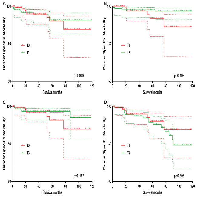 Figure 2: Kaplan Meier curves of cancer-specific mortality for matched T-stage pairs. Age, sex and race matching between T0 and T1 (A), T0 and T2 (B), T0 and T3 (C), T0 and T4 (D) patients.