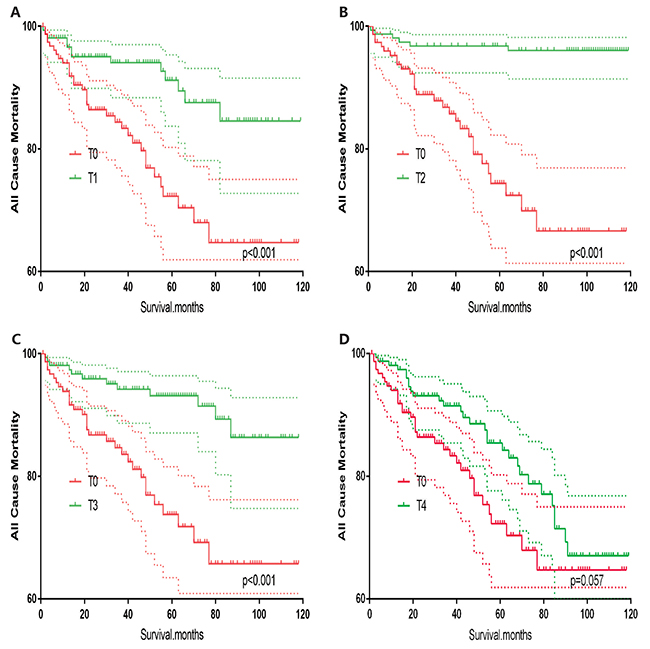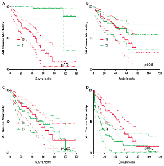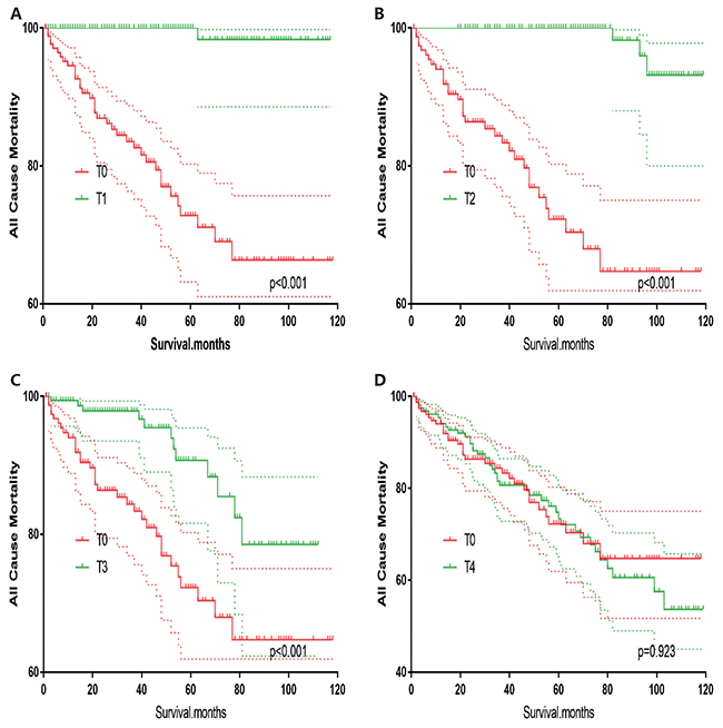 In survival analysis for all-cause mortality, T0 stage patients had a poorer prognosis compared to T1–T3 stage patients (all p<0.001, Figure 5A–5C), but similar prognosis as T4 stage patients after matching for age, sex and race (Figure 5D). Similar results were obtained after matching for age, sex and race, N/M stage, histologic subtype (Figure 6A–6D). After matching for all influential factors including surgery and radiation treatment, T0 stage patients showed a better prognosis for all-cause mortality compared to T1 stage patients (p<0.001, Figure 7A), but no difference when compared to T2–T4 patients (Figure 7B–7D).