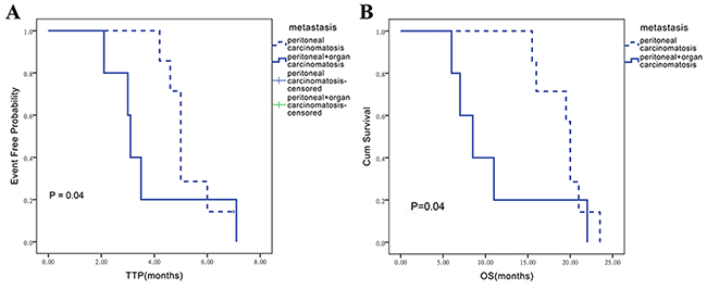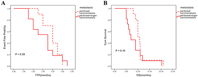 This retrospective observational study analyzed pathological, imaging, and treatment data from 33 patients with advanced stage GC associated with PC enrolled in Wuhan Union Hospital, Huazhong University of Science and Technology, from January 2014 to December 2016. Inclusion criteria were: age ranging from 18 to 75 years; GC diagnosed by pathology; PC confirmed by CT or MRI imaging, with at least one evaluable lesion according to the Response Evaluation Criteria in Solid Tumor (RECIST) standard [31]; up to two cycles (21 days/cycle) of first-line chemotherapy for metastatic GC received after diagnosis (with or without Endostar); efficacy evaluation completion, and traceable follow-up. Clinical characteristics, such as age, gender, physical condition, tumor differentiation, staging, metastatic sites, and treatment method (radical surgery or adjuvant chemotherapy) were recorded. All patients effectively receiving treatment were followed-up until collection of survival data was complete. This study was approved by the Ethics Committee of Huazhong University of Science and Technology.