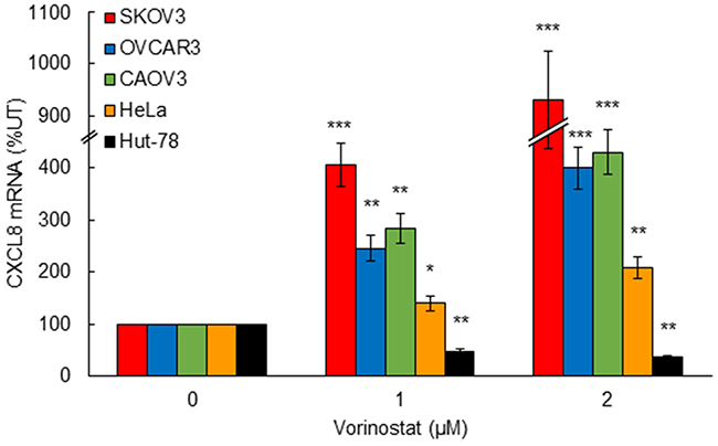 Despite the limited effectiveness of HDAC inhibitors as a single agent therapy in ovarian cancer and other solid tumors, the HDAC inhibitors vorinostat and romidepsin have been remarkably effective in the treatment of CTCL [14-19]. Since we have recently shown that HDAC inhibition specifically induces CXCL8 expression in OC cells, resulting in their increased survival and proliferation [5], we wanted to determine whether HDAC inhibition by vorinostat induces the CXCL8 expression also in CTCL cells, where vorinostat has been effectively used for CTCL treatment. Interestingly, while vorinostat significantly increased the CXCL8 expression in ovarian cancer SKOV3, OVCAR3, and CAOV3 cells, as well as in cervical cancer HeLa cells, the CXCL8 expression in CTCL Hut-78 cells was actually inhibited by 1 and 2 μM vorinostat (Figure 1), which approximately corresponds to the clinically used concentrations [32]. These data suggest that the HDI-induced CXCL8 expression may represent one of the mechanisms responsible for the limited effectiveness of HDAC inhibitors in OC treatment.