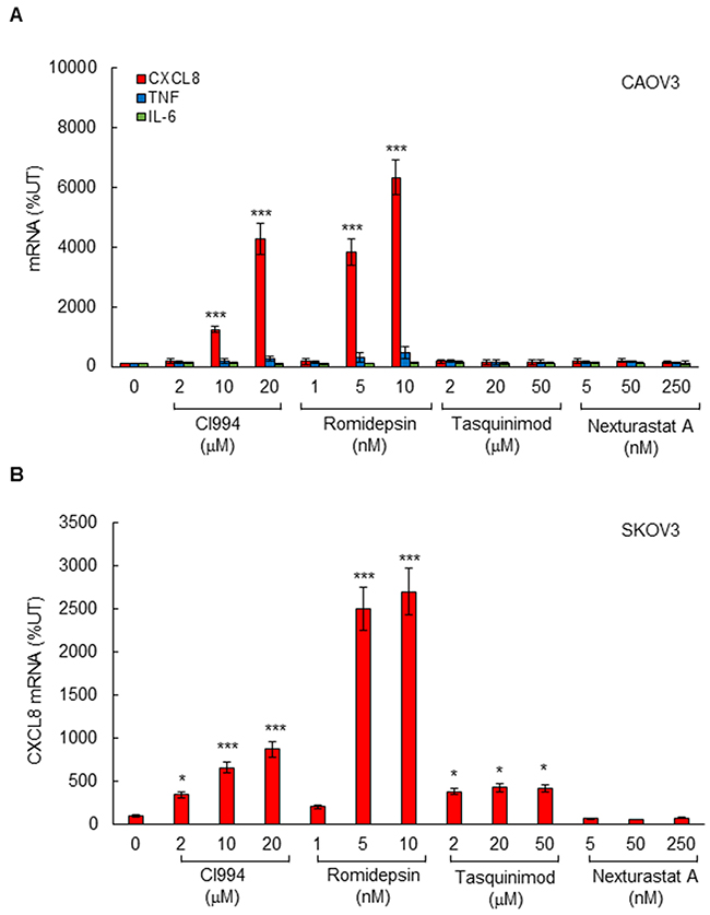 Figure 2: Class I HDAC inhibition induces CXCL8 expression in OC cells. (A) Real time RT-PCR analysis of mRNA levels of CXCL8, TNFα, and IL-6 in CAOV3 cells incubated with CI994, romidepsin, tasquinimod, or nexturastat A for 48 hours. (B) Real time RT-PCR of CXCL8 mRNA levels in SKOV3 cells incubated with CI994, romidepsin, tasquinimod, or nexturastat A for 48 hours. The values represent the mean +/-SE of four experiments; asterisks denote a statistically significant (* p<0.05; ** p<0.01; *** p<0.001) change compared to control untreated (UT) cells.