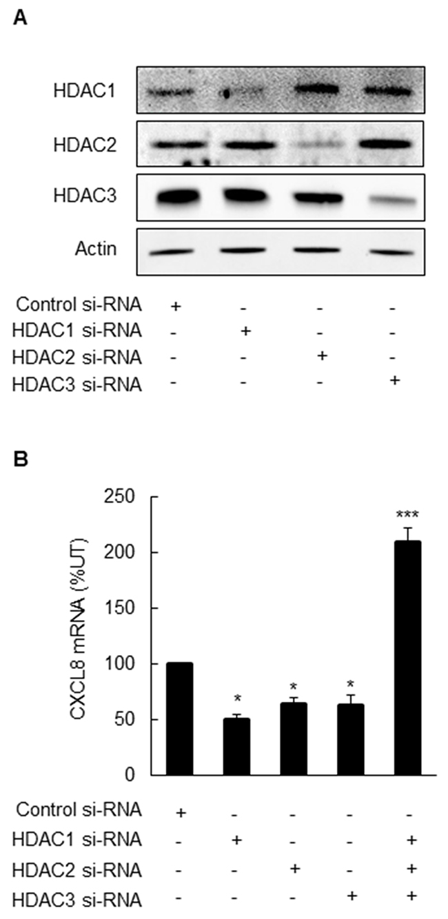 To confirm the pharmacological inhibition results and analyze the roles of the individual class I HDACs in the CXCL8 regulation in OC cells, we analyzed CXCL8 expression in SKOV3 cells transfected with HDAC1, -2, and -3 siRNAs. Transfection with HDACs specific siRNAs reduced their corresponding protein levels, demonstrating specificity of the transfections (Figure 3A). Surprisingly however, in contrast to the pharmacological inhibition that increased the CXCL8 expression, silencing the individual HDAC1, -2, or -3 decreased the CXCL8 mRNA levels in OC cells (Figure 3B). Simultaneous suppression of HDAC1, -2, and -3 induced the CXCL8 expression (Figure 3B); however, this increase was considerably lower compared to the pharmacological inhibition by class I HDAC inhibitors (Figure 2).