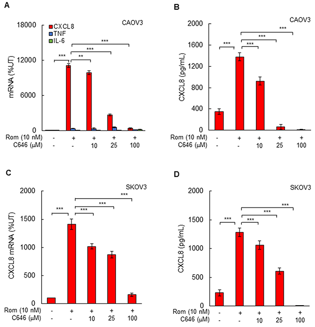 Figure 4: Romidepsin-induced CXCL8 expression in OC cells is dependent on HAT activity. (A) Real-time RT-PCR of mRNA levels of CXCL8, TNFα, and IL-6, and (B) ELISA of CXCL8 release in CAOV3 cells pre-treated with increasing C646 concentrations for 12 h, followed by incubation with 10 nM romidepsin for 48 h. (C) RT-PCR of CXCL8 mRNA levels, and (D) ELISA of CXCL8 release in SKOV3 cells pre-incubated with C646 and treated with romidepsin as described above. The values represent the mean +/-SE of four experiments; asterisks denote a statistically significant change compared to UT cells, or cells treated with romidepsin alone.