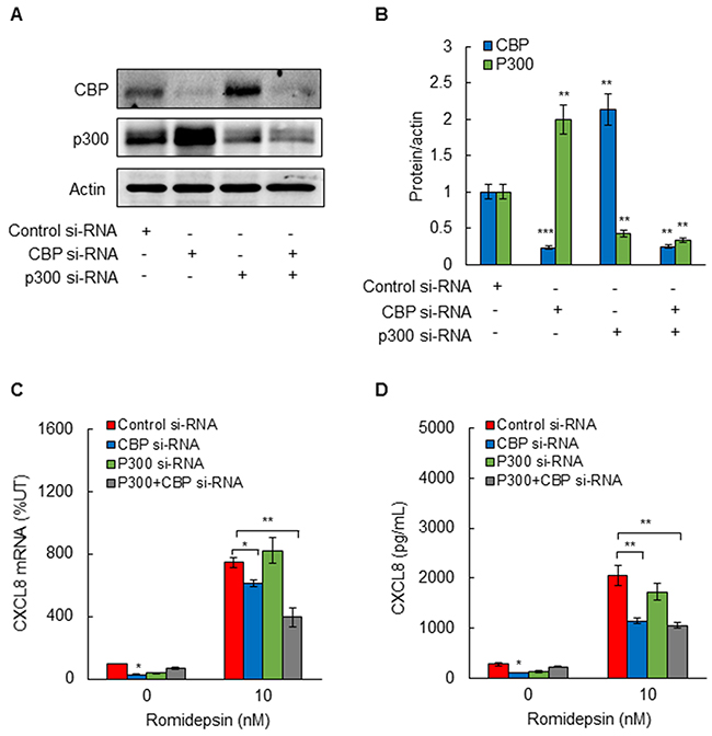Figure 5: Suppression of CBP inhibits romidepsin-induced CXCL8 expression in OC cells. (A) Western blotting analysis of CBP, p300, and control actin levels in whole cells extracts prepared from SKOV3 cells transfected with control siRNA, or siRNA specific for p300 or CBP, alone and in combination. Each lane corresponds approximately to 5x104 cells. (B) Densitometric evaluation of CBP and p300 protein levels shown in panel A, normalized to actin. The values for control siRNAs were arbitrarily set to 1, and the other values are presented relative to these values. (C) RT-PCR of CXCL8 mRNA levels; and (D) ELISA of CXCL8 release in SKOV3 cells transfected with control, CBP, and/or p300 siRNA, and treated 48 h with 10 nM romidepsin or control DMSO. The values represent the mean +/-SE of four experiments; asterisks denote a statistically significant change compared to cells treated with control siRNA.