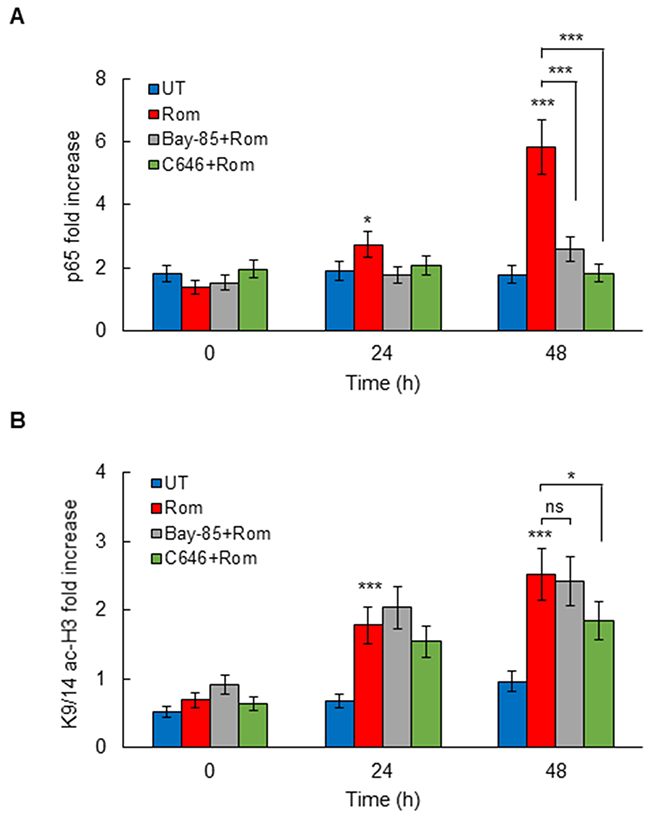 Figure 6: Romidepsin induces HAT-dependent p65 and K9/14 ac-H3 occupancy at CXCL8 promoter. ChIP analysis of p65 occupancy (A) and K9/14 ac-H3 occupancy (B) at CXCL8 promoter quantified by real-time PCR, in SKOV3 cells pre-treated 12 h with 5 μM Bay-118075, 25 μM C646, or control DMSO, and incubated with 10 nM romidepsin. The results are presented as a fold difference in occupancy over the human IGX1A (SA Biosciences) sequence control, and represent the mean +/-SE of three experiments; asterisks denote a statistically significant change compared to control UT cells.