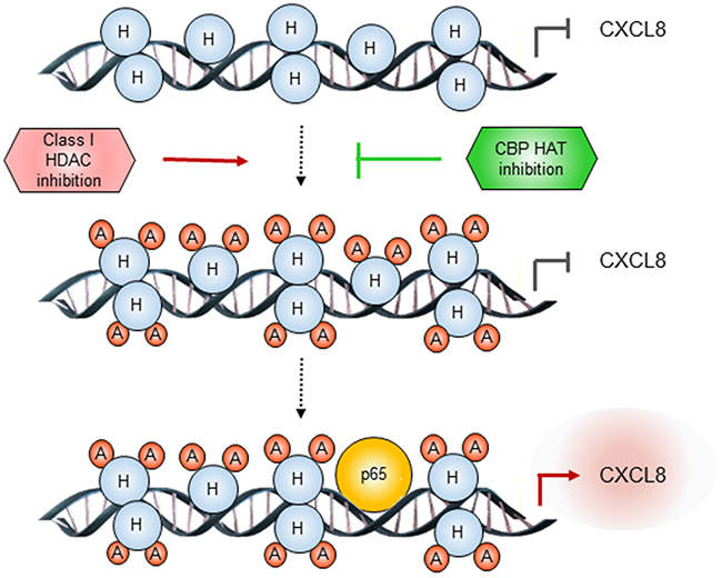 Together, our results demonstrate that the CXCL8 expression in OC cells is induced by simultaneous inhibition of HDAC1, -2, and -3, and suppressed by inhibition of CBP HAT activity, suggesting that targeting class I HDACs and CBP may provide novel combination strategies for OC treatment by limiting the increased CXCL8 expression.