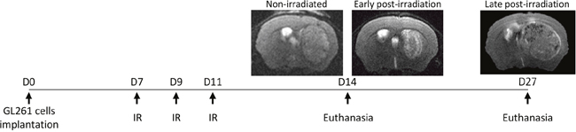Figure 1: Experimental protocol of the GL261 glioma model with the representative MRI of the non-irradiated, early post-irradiation and late post-irradiation animals. Non-irradiated and early post-irradiation tumors were both arrested 14 days after the GL261 cells implantation (non-irradiated tumor volume≈40mm3; early post-irradiation tumor volume≈10mm3) to match in time and just before the complete regression of the irradiated tumors. Late post-irradiation tumors, corresponding to recurrence, were arrested when the tumor reached 50 mm3. This time point does not have non-irradiated tumors because the control tumors developed too rapidly without any treatments.