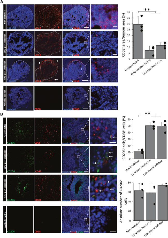 We first aimed to determine whether X-ray radiation could influence MΦ present in GB. For that, GL261 GB-bearing mice were exposed to X-rays 7 days after cells implantation. Early post-irradiation treated animals and their respective controls were euthanized 14 days after cells implantation (3 days after the last IR) and late post-irradiation animals were euthanized 27 days after cells implantation (16 days after the last IR) (Figure 1). MΦ were detected by CD68 immunostaining. CD68+ cells were observed in the tumor mass of both non-irradiated and irradiated mice (Figure 2A). In non-irradiated mice, the density of CD68+ cells present in the core of the tumor was about 29.5±6.5% of the tumor area. However, after X-ray radiation, a significant decrease in CD68+ cells was observed. The density of CD68+ cells was 7.2±3.8% and 11.4±2.4% in the tumor mass early and late after X-ray treatment, respectively. However, in the late post-irradiation tumors, we can detect the presence of CD68+ cells outside the tumor core (white arrows). This suggests that CD68+ cells start to be recruited within the tumor. We then evaluated the percentage of M2 MΦ before and after IR by CD206 immunostaining (Figure 2B). While CD206+ cells represented about 12.0 ± 2.4 % of the CD68+ cells in the non-irradiated group, it significantly increased to 50.7 ± 5.3% and 49.9 ± 6.1 % in the tumor mass early and late after radiation, respectively, without any change in the absolute number of M2 MΦ (Figure 2B).