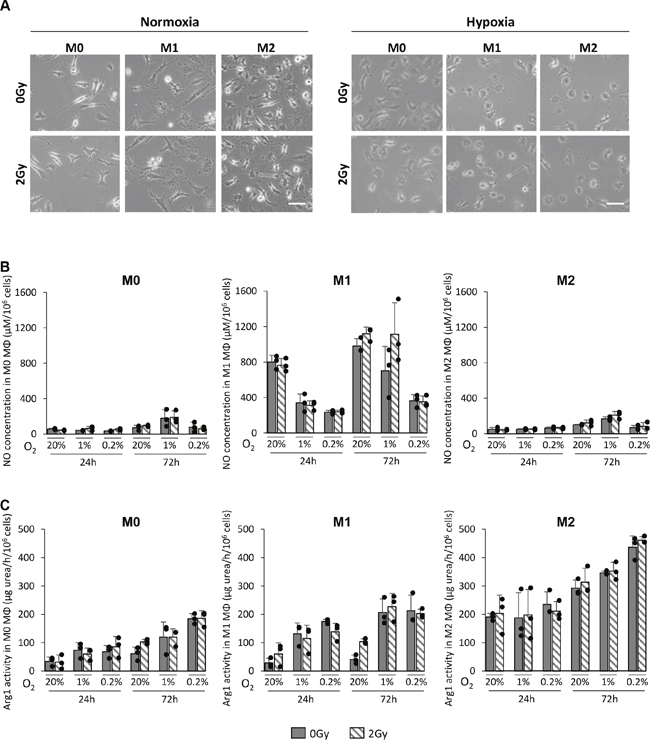 Figure 3: X-ray radiation does not change the phenotype of MΦ in vitro. (A) Representative phase contrast microscopy images of M0, M1 and M2 MΦ 24h after 0Gy and 2Gy radiation in 20% (normoxia) or 0.2% O2 (hypoxia). Scale bar=20μm. (B) NO concentration (μM per 106 cells) in M0, M1 and M2 MΦ 24h and 72h after 0Gy and 2Gy in 20%, 1% and 0.2% O2. (C) Arg1 activity (μg urea/h per 106 cells) in M0, M1 and M2 MΦ 24h and 72h after 0Gy and 2Gy radiation in 20%, 1% and 0.2% O2. n=3 different experiments per condition.