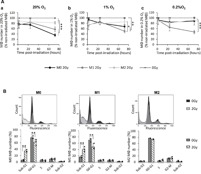 Figure 4: X-ray radiation induces cell death of M0 and M1 MΦ but not that of M2 MΦ in vitro. (A) Kinetics (2h, 24h and 72h post-radiation) of M0, M1 and M2 MΦ cell numbers expressed as a percentage of control (0Gy) after 2Gy in 20% (a), 1% (b) or 0.2% O2 (c). Dotted lines correspond to non-irradiated M0, M1 and M2 MΦ. n=3 distinct experiments for each time point and each MΦ phenotype. Tukey’s HSD test after significant one factor ANOVA (group) was used. Statistical significance was achieved when p<0.05(*), p<0.01(**) and p<0.001(***). (B) Cell cycle profiles and quantification of the cell distribution in different phases for M0, M1 and M2 MΦ 72h after 0Gy and 2Gy in 20% O2. n=3 different experiments per condition. Statistical significance was p<0.01(**).
