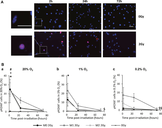 Figure 5: X-ray radiation generates DNA double strand breaks (DSBs) in the three MΦ phenotypes in vitro. (A) Representative γH2AX and Hoechst 33342 immunofluorescence images of M0 MΦ 2h, 24h and 72h after 0Gy and 2Gy radiation in 20% O2. Scale bars=20μm. (B) Kinetics (2h, 24h and 72h post-radiation) of DNA DSBs (γH2AX+ cells) on M0, M1 and M2 MΦ after 2Gy in 20% (a), 1% (b) and 0.2% O2 (c). Dotted lines correspond to the mean of γH2AX+ cells in non-irradiated M0, M1 and M2 MΦ. n=3 experiments for each time point and each MΦ phenotype. Tukey’s HSD test after significant one factor (group) or two factors ANOVA (time and group) were used. p<0.05(*) M0 2Gy vs M0 0Gy, p<0.05(#) M1 2Gy vs M1 0Gy and p<0.05(+) M2 2Gy vs M2 0Gy only 2h post-radiation. p<0.05($) and p<0.01($$) M1 kinetic curve vs M1 0Gy, M0 2Gy and M2 2Gy kinetics curves.