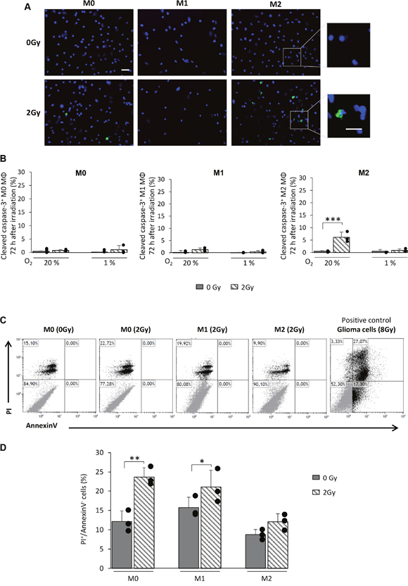 Figure 6: X-ray radiation fails to give rise to apoptosis in M0 and M1 MΦ in vitro. (A) Representative cleaved-caspase-3 and Hoechst 33342 immunofluorescence images of M0, M1 and M2 MΦ 72h after 0Gy and 2Gy radiation in 20% O2. Scale bar=20μm for low magnification and scale bar=10μm for high magnification. (B) Quantification of cleaved-caspase-3 on M0, M1 and M2 MΦ 72h post-radiation (0Gy and 2Gy) in 20% and 1% O2. n=3 experiments per condition. Statistical significance was seen with the irradiated M2 MΦ [p<0.001(***)], otherwise no significant changes were noted. (C) Representative propidium iodide (PI)/AnnexinV flow cytometry profiles of non-irradiated M0 MΦ (0Gy) and M0, M1 and M2 MΦ 72h after irradiation (2Gy). Irradiated glioma cells (8Gy) were used as positive control for AnnexinV staining. (D) Quantification of IP+/AnnexinV- cells in M0, M1 and M2 MΦ 72h after 0Gy and 2Gy radiation. n=3 different experiments per condition. Statistical significance was achieved when p<0.05(*) and p<0.01(**).