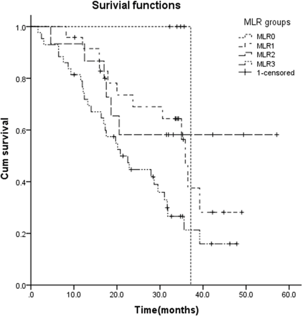 After a median follow-up time of 31 months (range:2 to 57months), 50 patients (57.5%) succumb to the disease. The median DFS was 24.8 months and median (OS) was 31.7 months. The overall 3-year survival rate was 36.4%. OS of the MLR0 to MLR3 categories was 37.1m, 35.9m, 31.5m and 20.8m, respectively (p=0.013) (Figure 1).