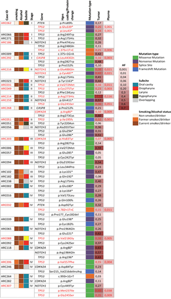 Figure 2: Description of TP53 mutations identified in Tumor, plasma and oral rinses from a series of 37 cases from the LA study. Only cases with TP53 mutations are shown. In red, mutations identified in matched tumor and oral rinses or plasma samples. AF: average allelic frequency from both libraries.