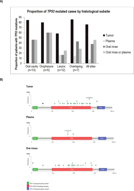 Figure 3: Comparison of TP53 mutations found in tumor, plasma and oral rinses from a series of 37 cases from the LA study. (A) Proportion of cases harboring TP53 mutations in tumor, plasma and oral rinses by subsite. (B) Diagrams of mutation distribution along the TP53 coding regions and protein domains. Mutation colors represent: green: Missense Mutations; black: Truncating Mutations (Nonsense, Nonstop, Frameshift deletion, Frameshift insertion, Splice site).