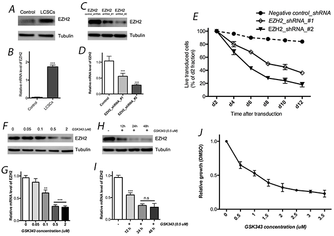 Figure 1: EZH2 expression in LCSCs. EZH2 expression in LCSCs by western blotting (A) and real-time quantitative RT-PCR (B) analyses. Both EZH2 shRNAs significantly decreased EZH2 expression in LCSCs at the protein (C) and mRNA (D) levels; (E) effects of EZH2_shRNA on cell growth of LCSCs; EZH2 protein (F) and mRNA (G) expression was affected by different concentration of GSK343; effect of GSK343 with different incubation time were also observed by western blotting (H) and real-time quantitative RT-PCR (I) analyses; (J) cell viability was evaluated after 4 days of incubation with GSK343. Each experiment was performed independently at least 3 times. Each experiment was performed in triplicate, ***P < 0.001, **P < 0.01, *P < 0.05.