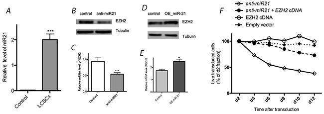 Figure 2: Effect of miR-21 on EZH2 expression in LCSCs. (A) Relative expression of miR-21 was detected in LCSC by real-time quantitative RT-PCR; (B) & (C) EZH2 expression was reduced by transfection with anti-miR-21 in LCSC; (D) & (E) EZH2 expression was enhanced by transfection with OE miR-21 in LCSC; (F) transfection of anti-miR-21 can induce toxicity in LCSCs, and exogenous EZH2 expression rescued LCSCs from anti-miR-21-induced toxicity. Each experiment was performed in triplicate, ***P < 0.001, **P < 0.01, *P < 0.05.