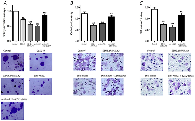 Figure 3: Effect of miR-21 and EZH2 on colony-formation, migration and invasion of LCSCs. (A) Colony-formation assays was decreased significantly after EZH2 or miR-21 knockdown, but rescued the effects of anti-miR-21 after overexpression of exogenous EZH2 in LCSCs; (B) & (C) cell migration and invasion were reduced significantly by EZH2 or miR-21 knock down, but exogenous EZH2 over expression rescued the effects of anti-miR-21 in LCSCs. Each experiment was performed in triplicate, ***P < 0.001, **P < 0.01, *P < 0.05.