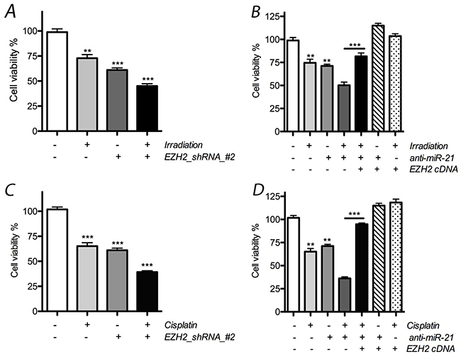 Figure 4: Effect of miR-21 or EZH2 on cell proliferation of LCSCs. (A) Combinative effect on cell proliferation was obtained obviously after treated with radiotherapy and EZH2_shRNA; (B) cell proliferation was reduced after combined with radiotherapy and anti-miR-21, but rescued above effects after overexpression of exogenous EZH2 in LCSCs; (C) combinative effect on cell proliferation was obtained obviously after treated with cisplatin and EZH2_shRNA; (D) cell proliferation was reduced after combined with cisplatin and anti-miR-21, but rescued above effects after ectopic expression of EZH2 in LCSCs. Each experiment was performed in triplicate, ***P < 0.001, **P < 0.01, *P < 0.05.