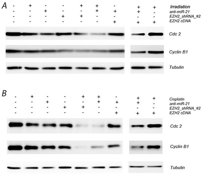 Figure 5: Effect of miR-21 or EZH2 on cell cell-cycle-related biomarkers in LCSCs. (A) Cdc2 and cyclin B1 expression after transfection with anti-miR-21 or EZH2 shRNA in the presence or absence of irradiation treatment on LCSCs; (B) Cdc2 and cyclin B1 expression after transfection with anti-miR-21 or EZH2 shRNA in the presence or absence of cisplatin treatment on LCSCs. Each experiment was performed in triplicate.