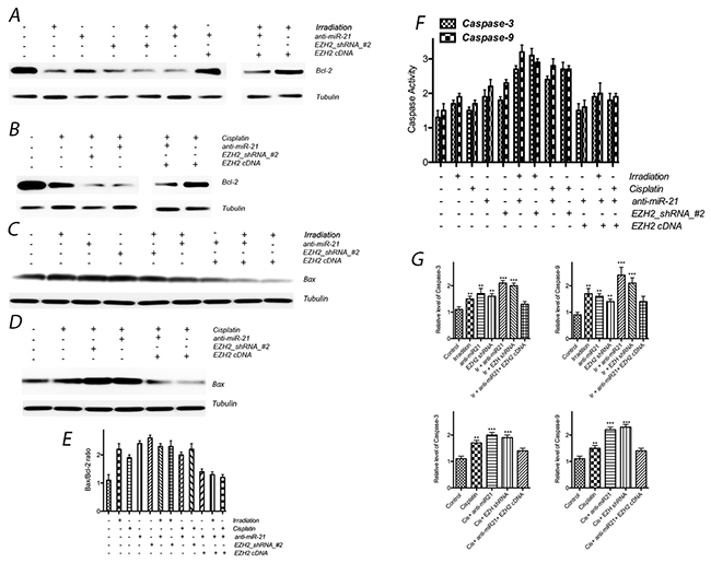 Figure 6: Effect of miR-21 or EZH2 on cell apoptosis of LCSCs. (A) Bcl-2 expression after transfection with anti-miR-21 or EZH2 shRNA in the presence or absence of irradiation treatment on LCSCs; (B) Bcl-2 expression after transfection with anti-miR-21 or EZH2 shRNA in the presence or absence of cisplatin treatment on LCSCs; (C) Bax expression after transfection with anti-miR-21 or EZH2 shRNA in the presence or absence of irradiation treatment on LCSCs; (D) Bax expression after transfection with anti-miR-21 or EZH2 shRNA in the presence or absence of cisplatin treatment on LCSCs; (E) the ratio between Bax and Bcl-2 also increased obviously after above treatment; (F) caspase activity were observed after above combinative treatment; (G) caspase exression were observed after above combinative treatment. Each experiment was performed in triplicate, ***P < 0.001, **P < 0.01, *P < 0.05.