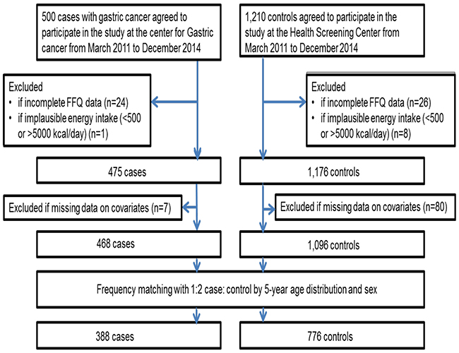 Study participants were enrolled from the Korean National Cancer Center (NCC) from March 2011 to December 2014. The details have been previously described [37]. Briefly, cases (ICD 10 code: C16) were defined as individuals who were newly diagnosed with early gastric cancer within three months and whose diagnoses were histologically confirmed at the NCC. The early stage of gastric cancer was identified as carcinomas restricted to the mucosa or submucosa [38]. Based on Lauren’s histological classification, study participants with non-cardia gastric cancer were categorized into intestinal or diffuse types [39]. Individuals with advanced gastric cancer, another type of cancer, severe mental disease, systematic disease, or diabetes mellitus and women who were pregnant or breast-feeding were excluded. Controls were recruited during the same period from the population of adults receiving health screening examinations at the NCC as part of a benefit program of the National Health Insurance Service. Those with gastric or duodenal ulcers, cancer, diabetes mellitus, or previous treatment for H.pylori infection were excluded. At enrollment, 1,710 individuals agreed to participate. Of those, 50 individuals were excluded for providing incomplete dietary data. Of the remaining 1,660 participants, 9 were excluded for reporting an implausible range of total energy intake of <500 kcal or >5000 kcal. Eighty seven adults were additionally excluded from the remaining 1,651 due to missing information regarding BMI (n=9), H. pylori infection (n=1), physical activity (n=8), education (n=65), or family history of gastric cancer (n=4). Of the remaining 1,564 participants, 388 cases and 776 controls were finally included based on frequency matching by age (within 5 years) and sex using a 1:2 ratio. As a result, 1,164 participants were included in the final analyses (Figure 1). All participants agreed to voluntarily participate in this study and provided written informed consent. All protocols for the current study were approved by the Institutional Review Board (IRB) of the NCC (IRB Number: NCCNCS-11-438). All methods for the current study were in accordance with the guidelines and regulations of the IRB.