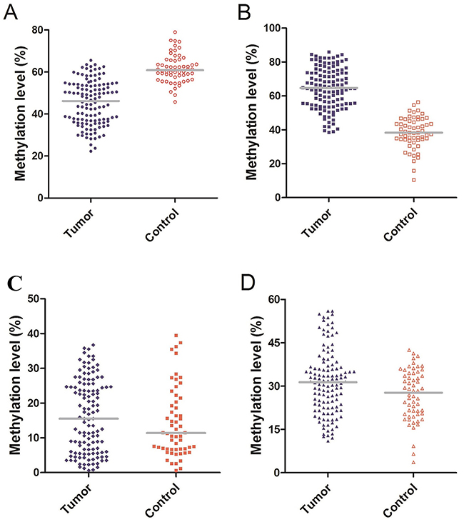 Figure 1: (A) Methylation level of Alu: The median methylation level of Alu was 46.15% (IQR, 36.57%–54.00%) and 60.85% (IQR, 57.23%–65.68%) in glioma patients and healthy controls. (B) Methylation level of MGMT: The median methylation level of MGMT was 64.65% (IQR, 54.87%–74.37%) and 38.30% (IQR, 34.13%–45.45%) in glioma patients and healthy controls. (C) Methylation level of RASSF1A: The median methylation level of RASSF1A was 15.50% (IQR, 5.85%–24.70%) and 11.40% (IQR, 6.78%–20.60%) in glioma patients and healthy controls. (D) Methylation level of P16: The median methylation level of P16 was 31.35% (IQR, 22.58%–36.93%) and 26.65% (IQR, 17.15%–36.05%) in glioma patients and healthy controls.