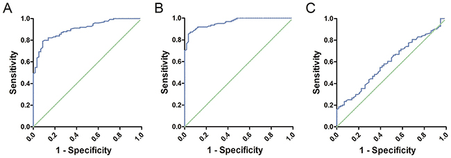Figure 2: (A) ROC curve of Alu: The Area Under Curve was 0.904. (B) ROC curve of MGMT: The Area Under Curve was 0.962. (C) ROC curve of P16: The Area Under Curve was 0.599.