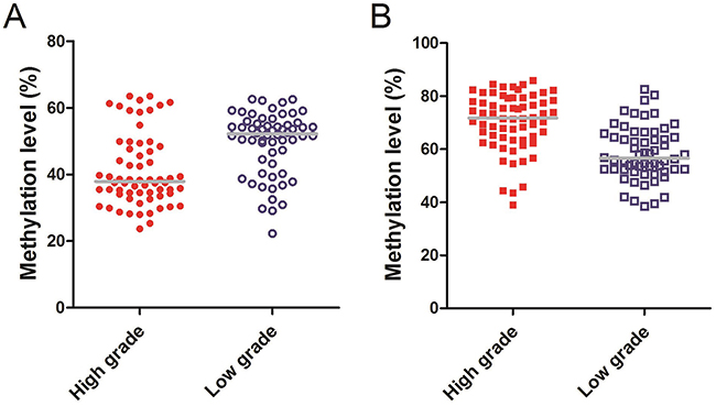 Figure 4: (A) Methylaiton level of Alu: The median methylation level of Alu in high-grade glioma was 37.90% (IQR, 34.15%–48.20%), while the low-grade was 52.20% (IQR, 43.53%–55.43%). (B) Methylaiton level of MGMT: The median methylation level of MGMT in high-grade glioma was 71.75% (IQR, 63.75%–75.10%), while the low-grade was 56.55% (IQR, 52.33%–65.48%).