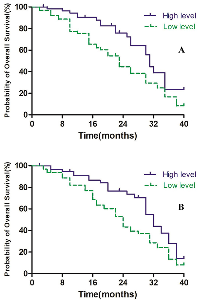 In the present study, we defined > 46.15% as high methylation level and ≤ 46.15% as low methylation level for Alu, and > 64.65% as high methylation level and ≤ 64.65% as low methylation level for MGMT. In Alu group, the patients with high levels were associated with higher survival rates compared to those with low levels, with median OS time was 31 months in the high level group and 23 months in low level group (P<0.01, Figure 5A). Furthermore, similar results were obtained in the MGMT group, with median OS time 32 months in high level group compared to 24 months in the low level group (P<0.01, Figure 5B).