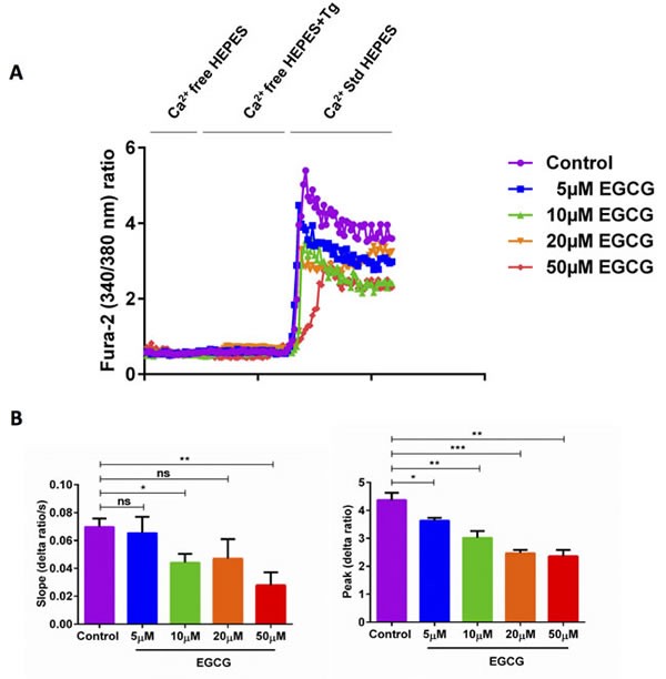 Figure 2: EGCG treatment significantly decreased SOCE in activated murine CD4+ T cells. A. Representative tracings showing the 340/380 nm fluorescence ratio reflecting cytosolic Ca2+ activity in Fura-2, AM loaded activated (plate bound anti-CD3 and anti-CD28) murine CD4+ T cells incubated for 72 hours without and with different concentration of (5-50 µM) EGCG followed by subsequent exposure to Ca2+-free HEPES, additional exposure to sarcoendoplasmatic Ca2+ ATPase (SERCA) inhibitor thapsigargin (Tg, 1 µM) and re-addition of extracellular Ca2+ (Ca2+ Std HEPES). B. Arithmetic means ± SEM (n = 4) of the slope (left) and peak (right) of the fluorescence ratio change following re-addition of extracellular Ca2+ in murine CD4+ T cells incubated for 72 hours without (violet bars) and with 5 µM (blue bars), 10 µM (green bars), 20 µM (orange bars), and 50 µM (red bars) EGCG. *(p < 0.05), **(p < 0.01), ***(p < 0.001) indicates statistically significant difference.