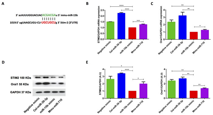 Figure 5: miR-15b mimic overexpression significantly decreased STIM2 and Orai1 transcript levels and protein abundance in murine CD4+ T cells. A. Cartoon showing the murine mmu-miR-15b (family of miR-16/miR-15a/miR-497/miR-322/miR-195) with STIM2 3’-untranslated region (3’-UTR) with seed sequence. B., C. Arithmetic means ± SEM (n = 4) of (B) STIM2/GAPDH and (C) Orai1/GAPDH transcript levels in negative mimic control (green bars), cel-miR-39-3p (blue bars), miR-15b mimic (red bars) and non-specific mmu-miR-710 (violet bars) transfected murine CD4+ T cells. *(p < 0.05), **(p < 0.01), ***(p < 0.001), ****(p < 0.0001) indicates statistically significant difference. D. Original Western blots (left panels) and E. arithmetic means ± SEM, (n = 3, right panels) of STIM2/GAPDH and Orai1/GAPDH protein abundance in murine CD4+ T cells in negative mimic control (green bars), cel-miR-39-3p (blue bars), miR-15b mimic (red bars) and non-specific mmu-miR-710 (violet bars) transfected murine CD4+ T cells. *(p < 0.05), **(p < 0.01), ****(p < 0.0001) indicates statistically significant difference.
